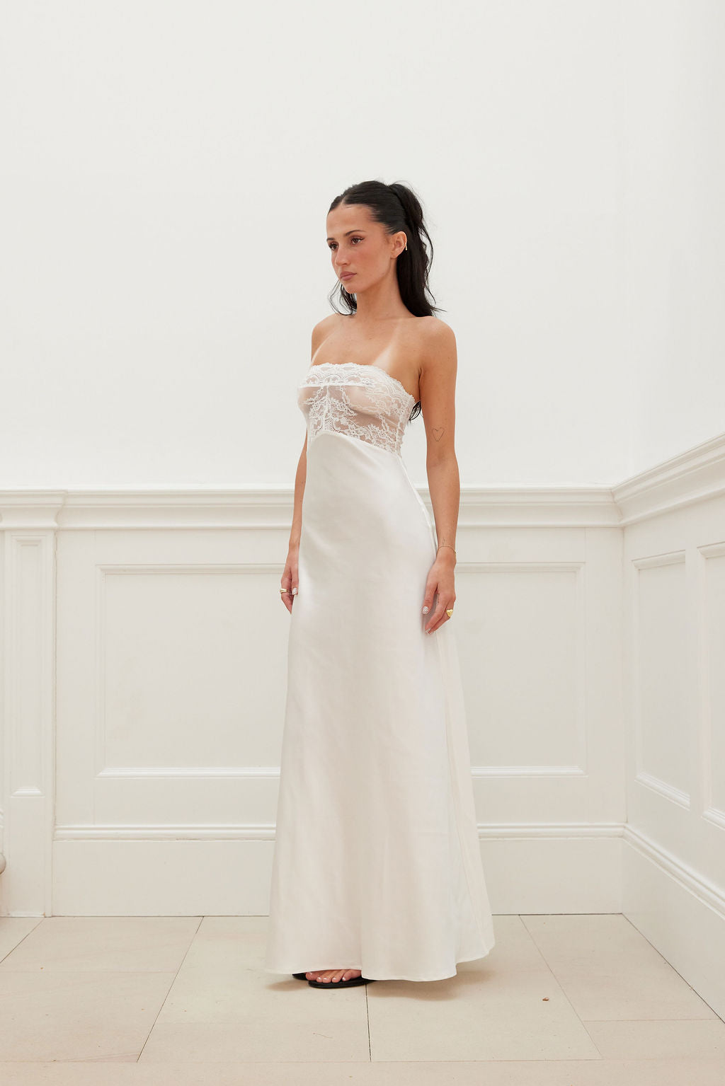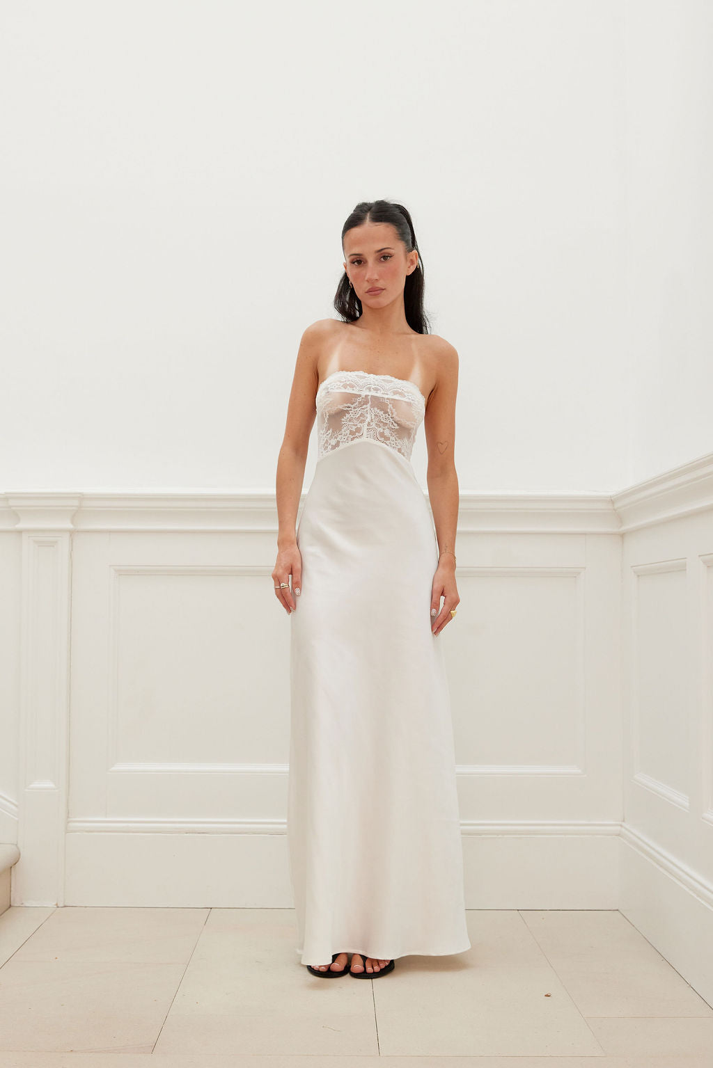 Our Lace Bust Bias Cut Maxi Dress is a sleek and timeless statement dress that transitions effortlessly from day to night. Its delicate lace bustier neckline and flowy silhouette is the perfect dress for evoking that classy look with a 90s touch. It is cut from a lightweight and breathable fabric.