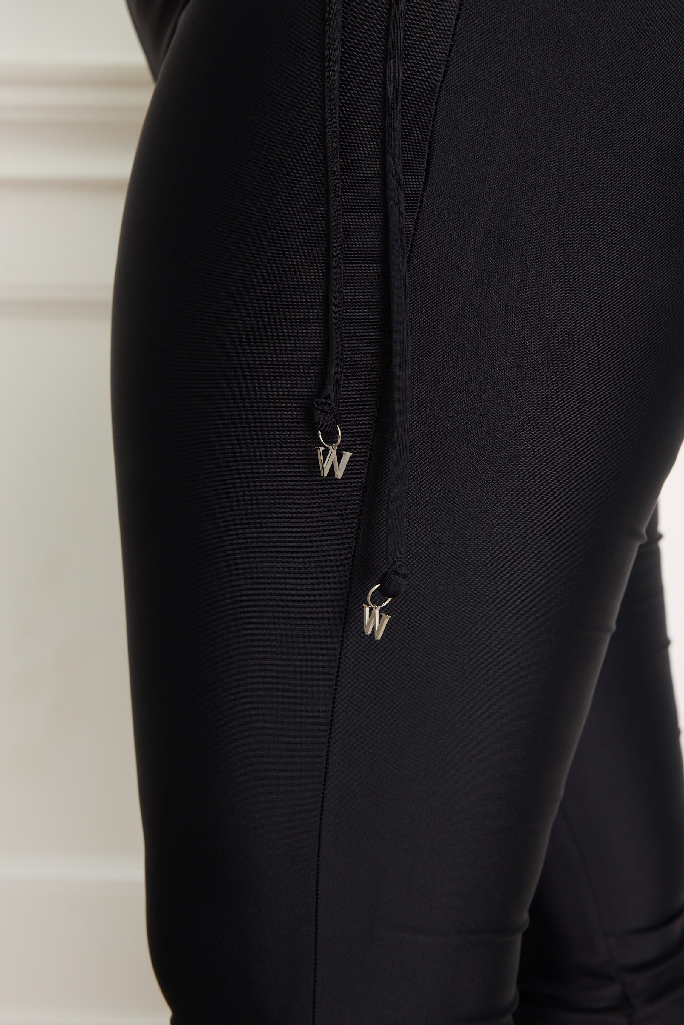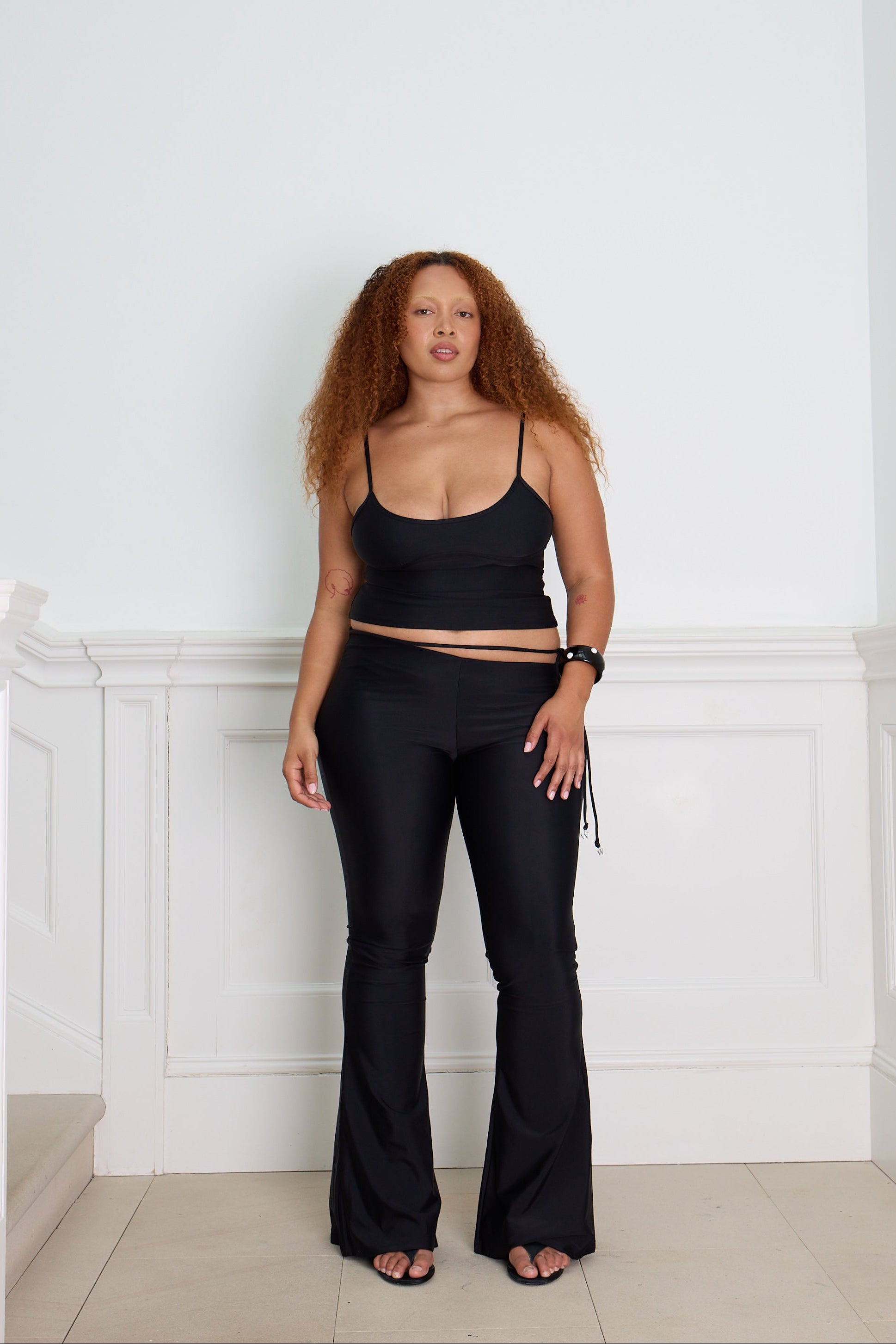 The Black Low Waisted Flare Pant channels understated sophistication with a modern edge. Cut in a low-rise fit, the sleek lines contour through the hip before extending into a graceful flare. Crafted from a fluid, lightweight fabric, these pants are designed to elongate the form while offering effortless movement from day to night. Metal hardware on waist tie with our signature W.