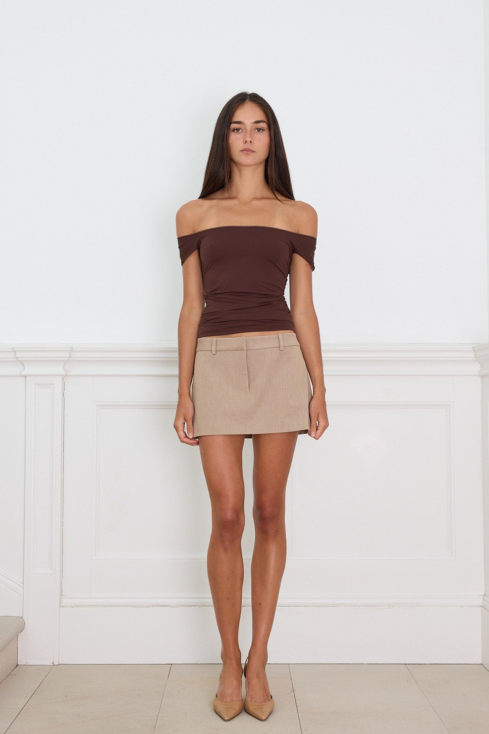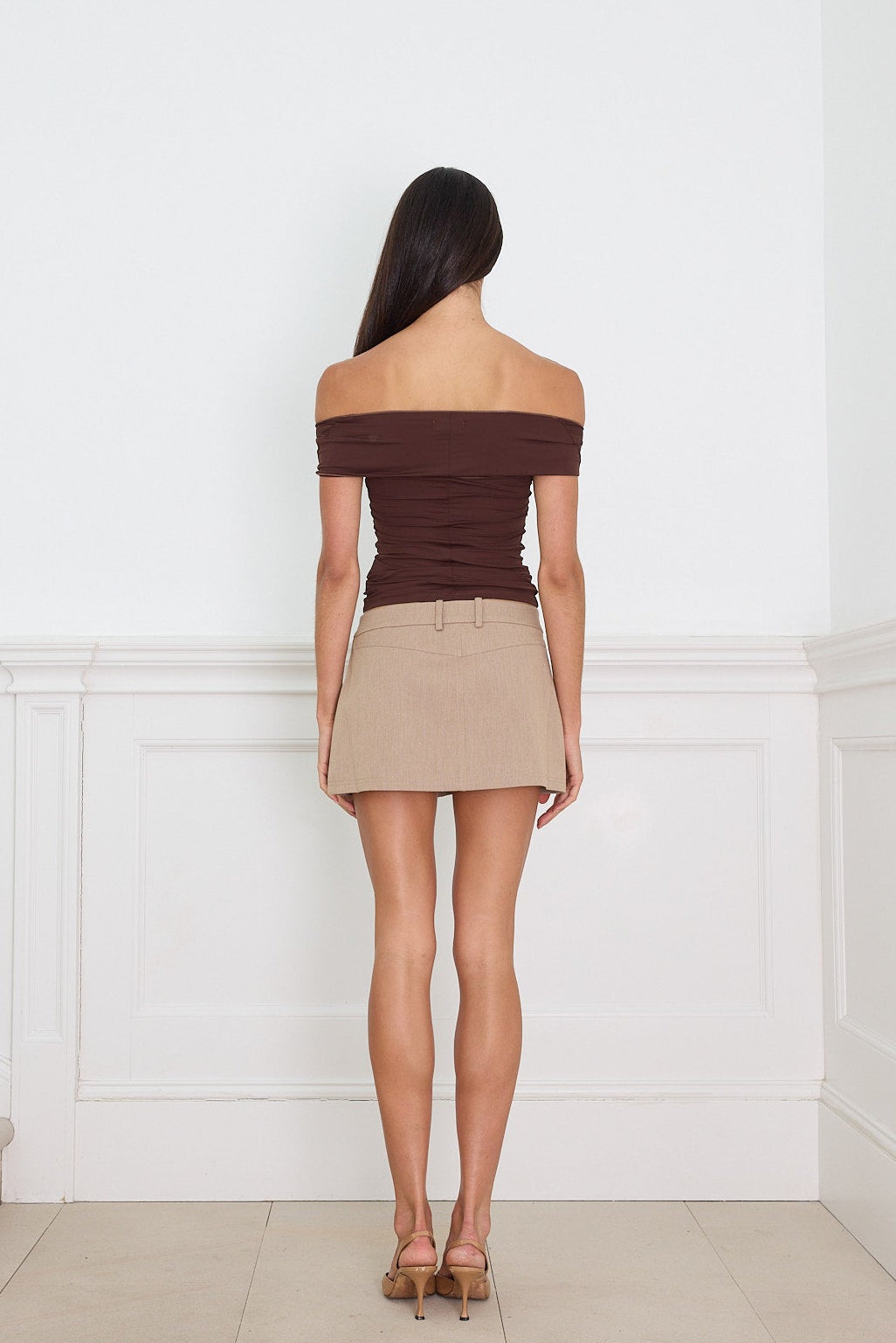 Our Micro Mini Skirt is a timeless mid rise mini skirt. Inspired by the perfect 90s mini skirt, crafted with a modern twist in a deep caramel. Cut in a heavy weight fabric, featuring a clean waistband with belt loops, a covered fly with button with a hook and eye closure, making it the perfect black mini skirt to pair back with anything. Our Micro Mini is tailored seamlessly and crafted for longevity.