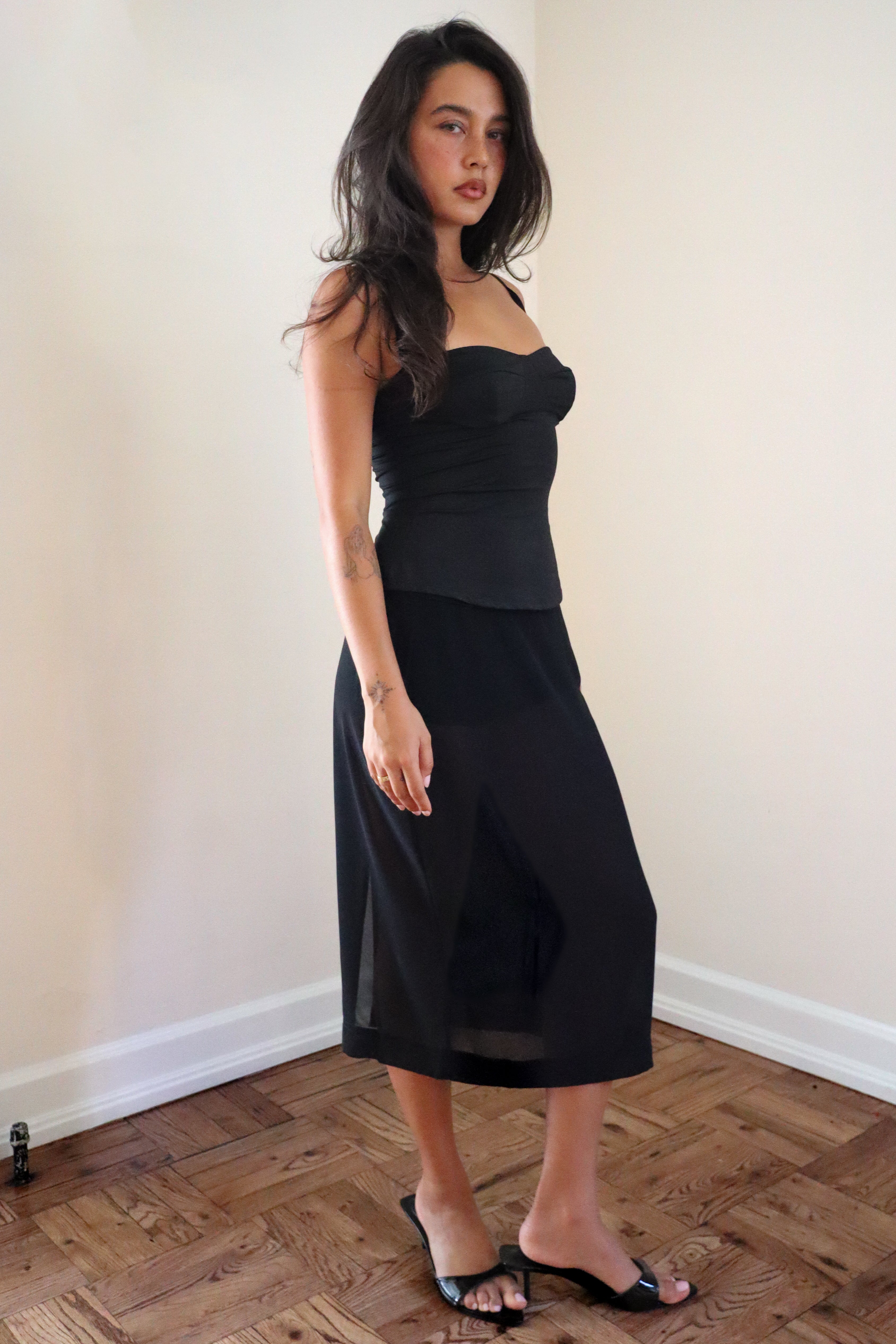 Our Sheer Mid Length Skirt is a sleek modern staple with a 90s feel. With a soft and flowy silhouette, in a sheer black overlay and a built in mini short lining, our sheer mid length skirt is the perfect staple and addition to your wardrobe. Crafted from a sheer featherweight fabric, created for longevity.