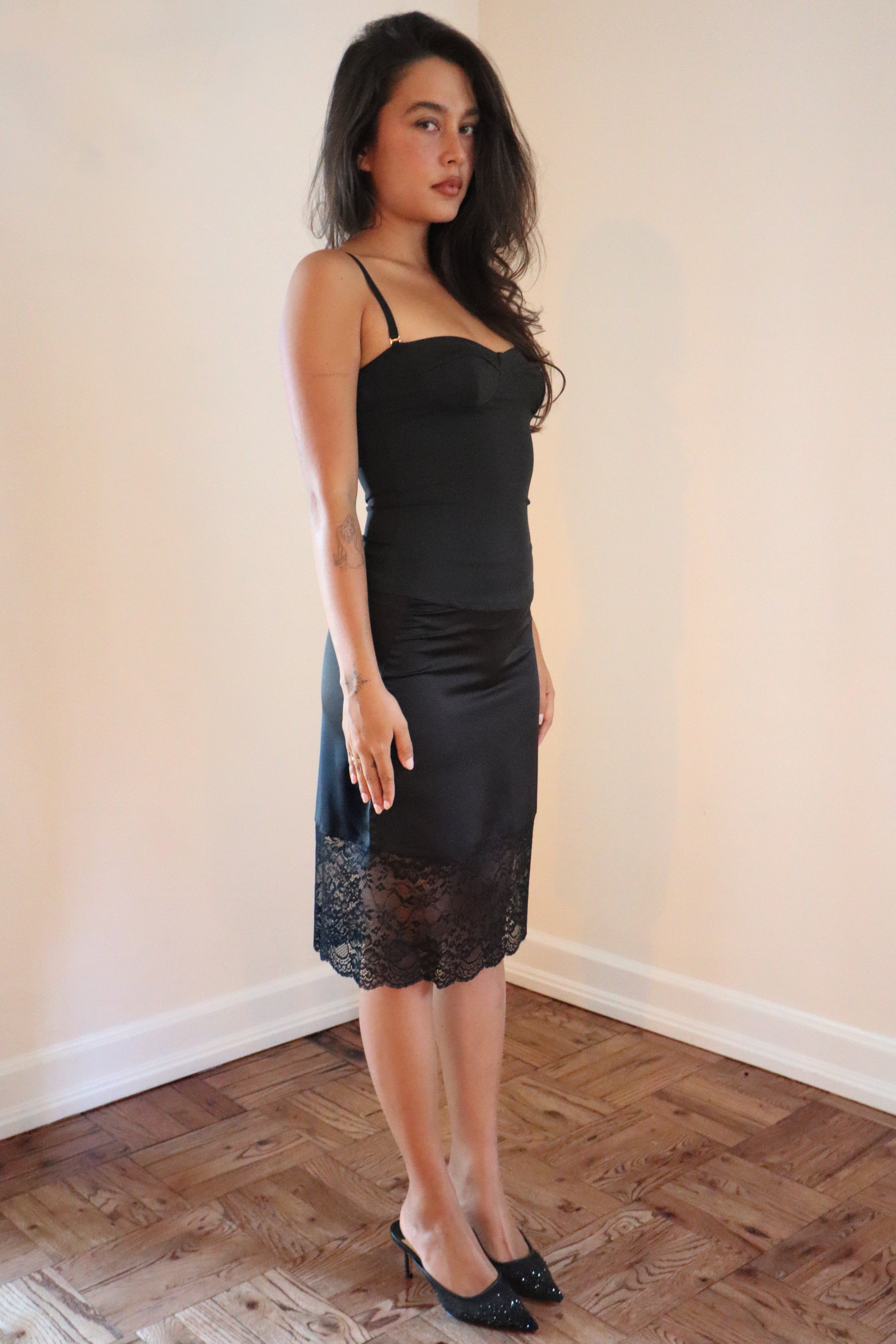 Our Midi Skirt with Lace Trim is a romantic and refined piece, crafted from a lightweight fabric with a delicate lace finish. Its soft drape and fluid silhouette offer romantic yet playful movement, while the intricate trim adds a touch of timeless femininity. Designed to transition seamlessly from day into evening, this skirt embodies a sexy 90s feel.