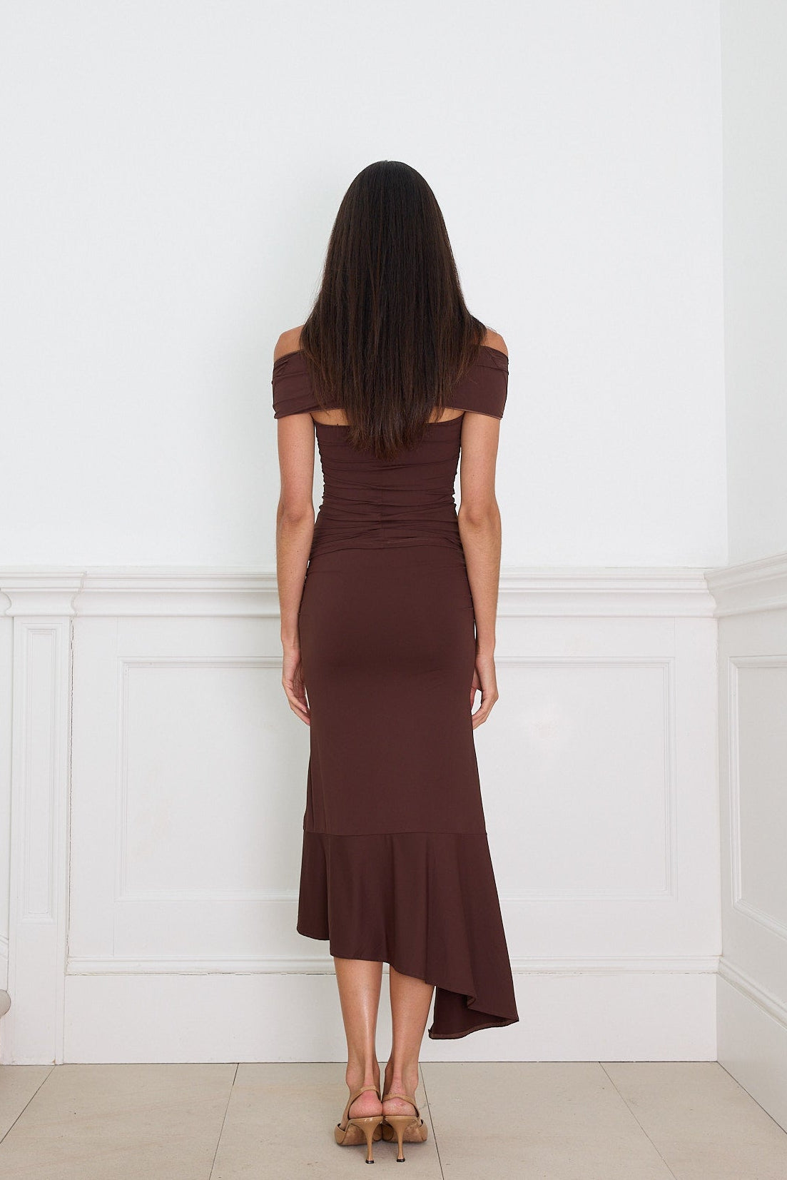 Our Contour Top is a sleek and versatile form fitting top with a square neck or off the shoulder finish. Cut from a lightweight and breathable fabric, in a rich chocolate brown, it is the perfect top to throw on, on a warm day or dress up for a night out. We prefer styling it back with our gradual draped skirt.