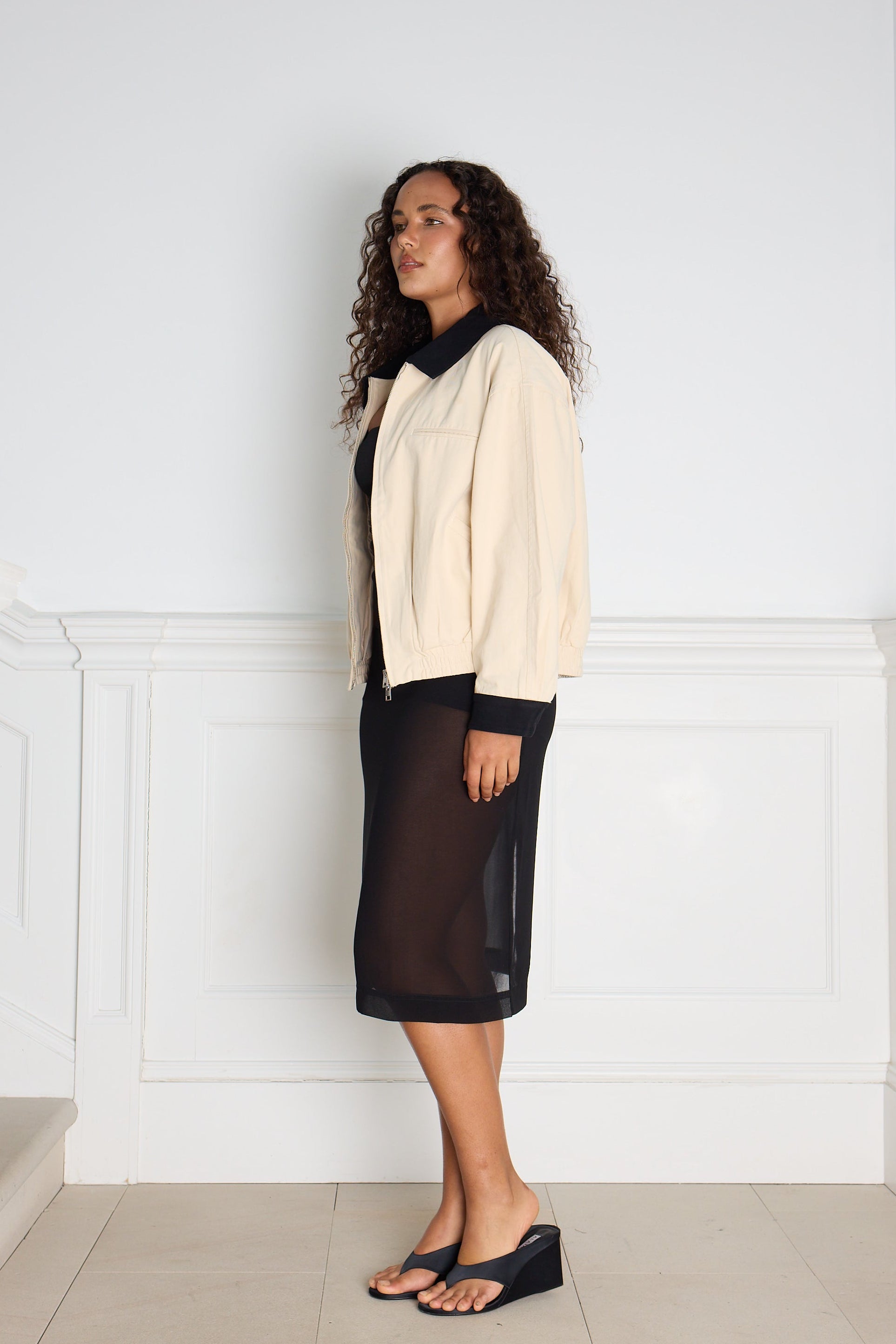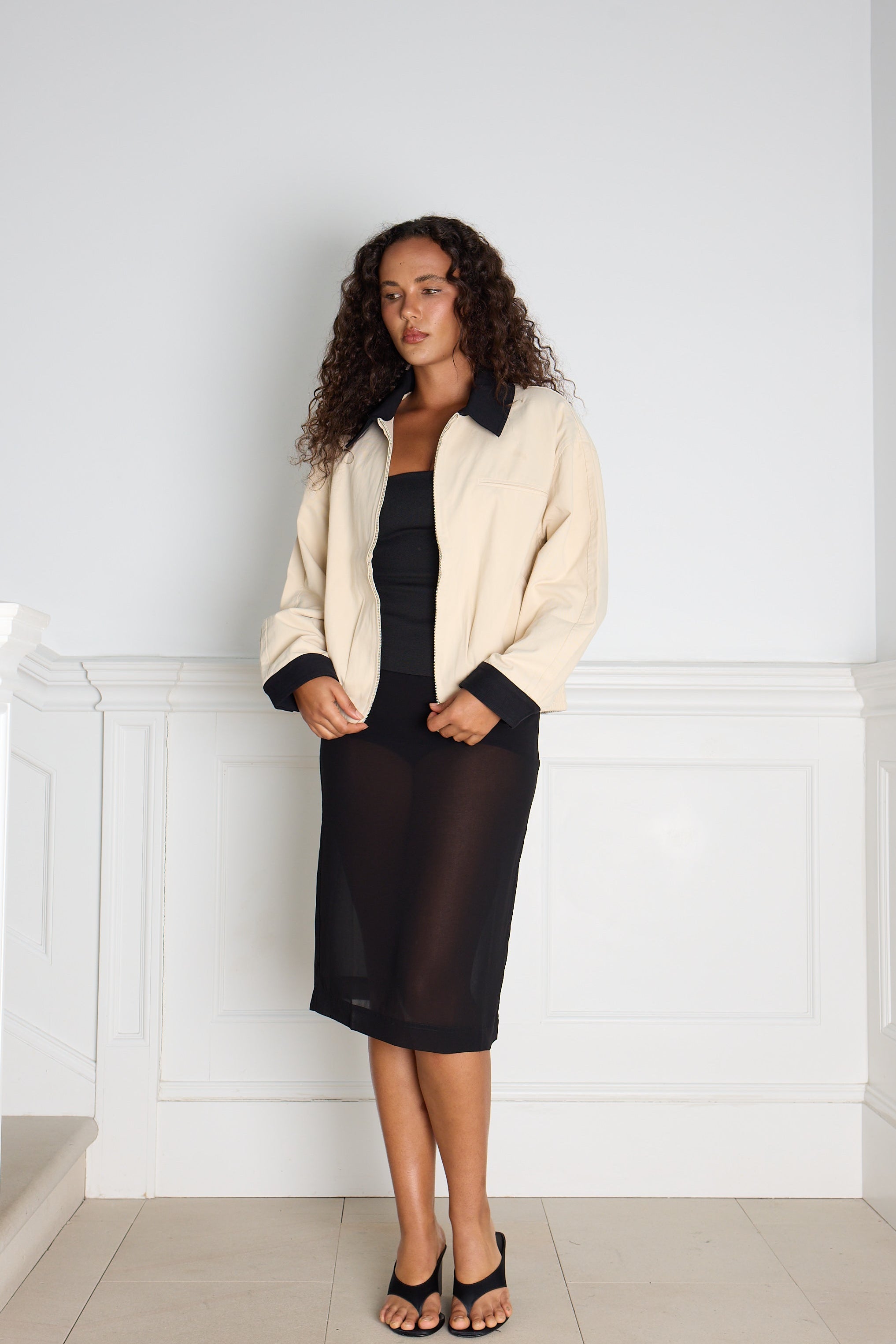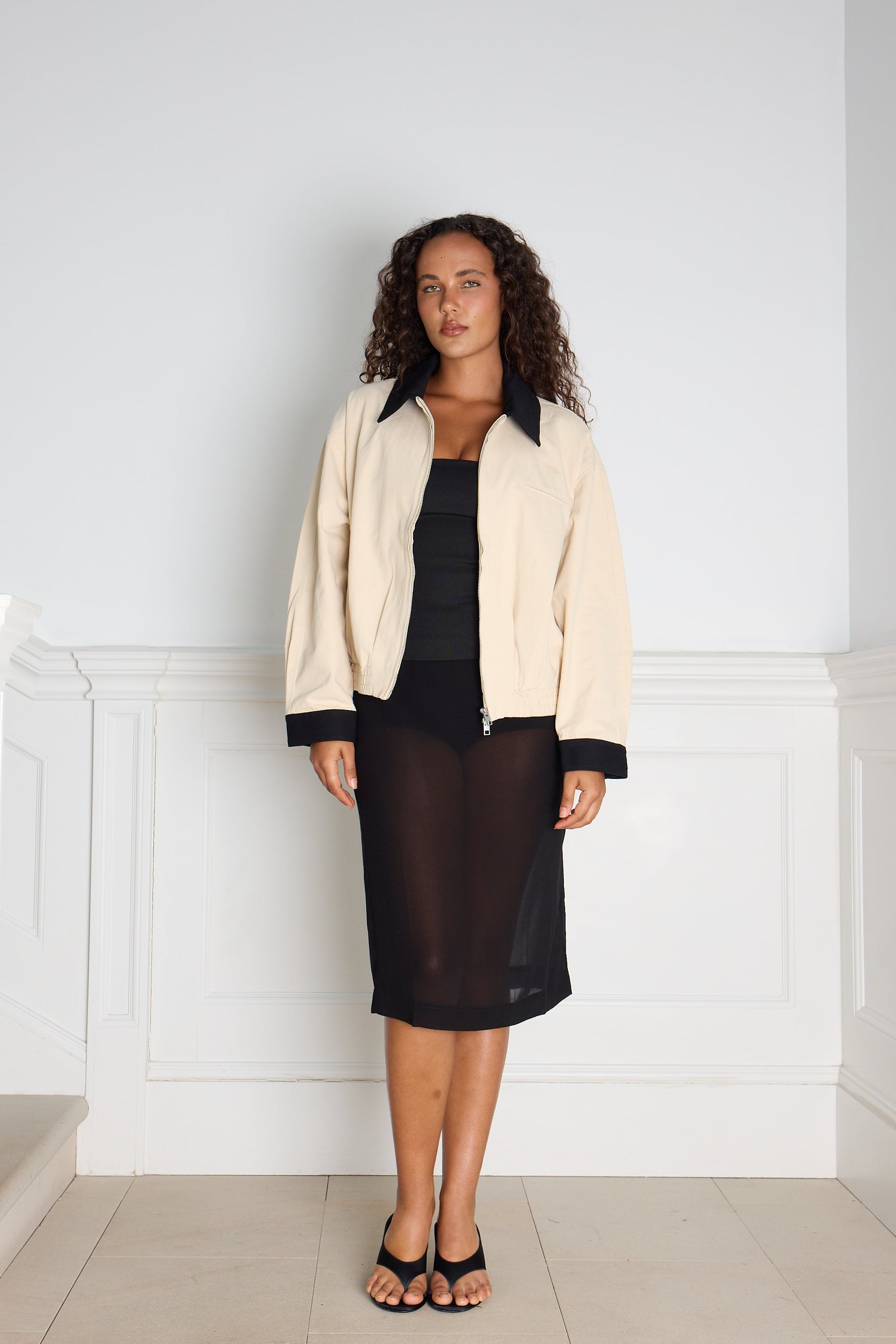 Our Contrast Jacket is an oversized, versatile front zip jacket with an exaggerated silhouette mimicking a bomber. Cut from a lightweight yet sturdy fabric, with contrasting beige and black accents, offering a modern twist on a classic staple piece. With a double ended zipper, welt side pockets and a relaxed collar, our contrast jacket is the perfect day to night overcoat. The perfect layering piece over a casual or dressed up outfit.